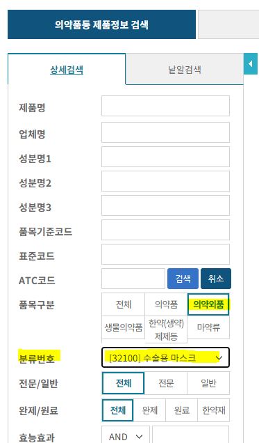 여기에서 중간부분 [품목구분 - 의약외품] 선택하시고 [분류번호 - 32100 수술마스크]를 선택하시고