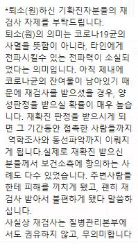 무증상 완치가 됐을수도 있지만, 여전히 전파력이 있는 양성자일 확률도 없다고 확신할 수가 없는 상황에서