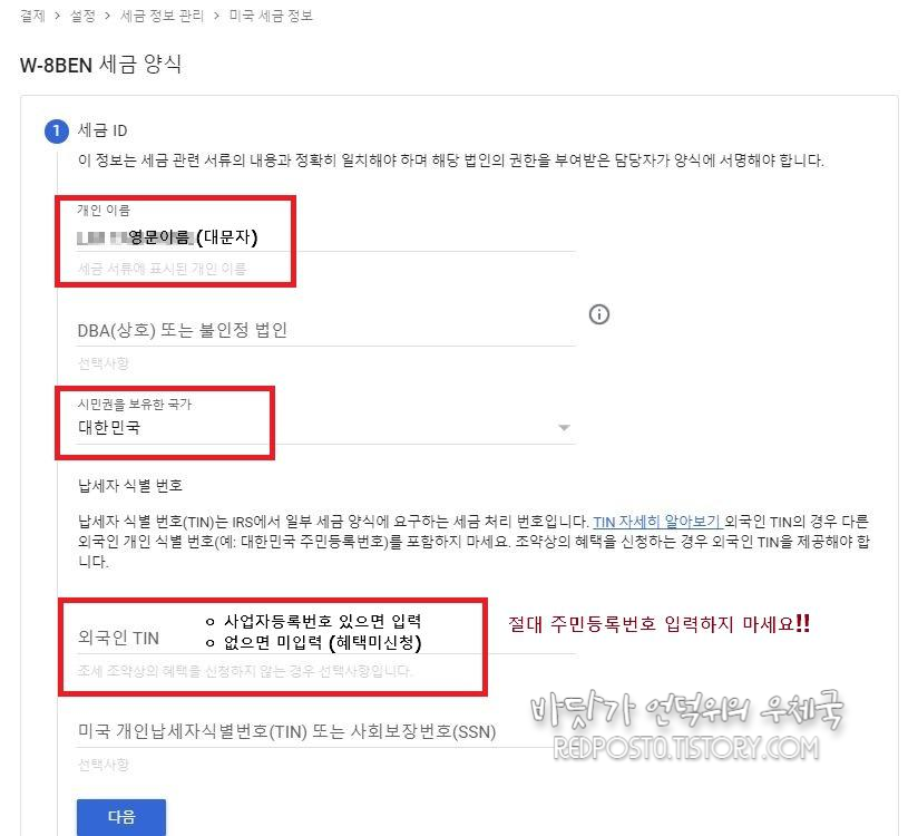 W-8BEN 세금양식 입력을 합니다.