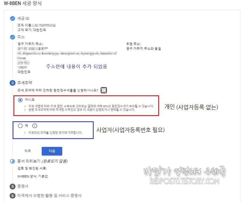 외국인 TIN에 사업자등록번호를 입력하신 분들은 "예"를 선택하고 국가에 대한민국을 선택합니다.