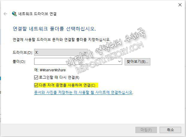 혹시나 네트워크 드라이브 생성시 옵션인 "다른 자격 증명을 사용하여 연결"로 하면 될까 싶어서 해봤는데.. 이것도 실패