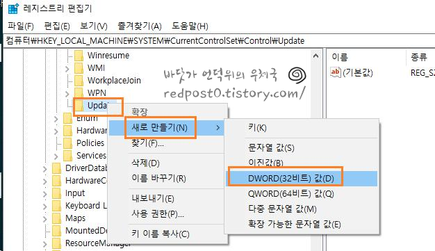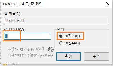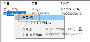 만들어진 DWORD(32비트)의 값 이름은 "UpdateMode" 로 입력합니다.