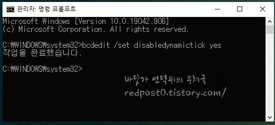 bcdedit /set disabledynamictick yes 을 입력해줍니다.