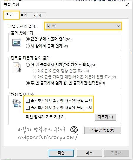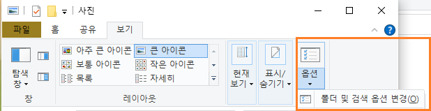 탐색기 - 옵션 - 폴더 및 검색옵션변경 에서