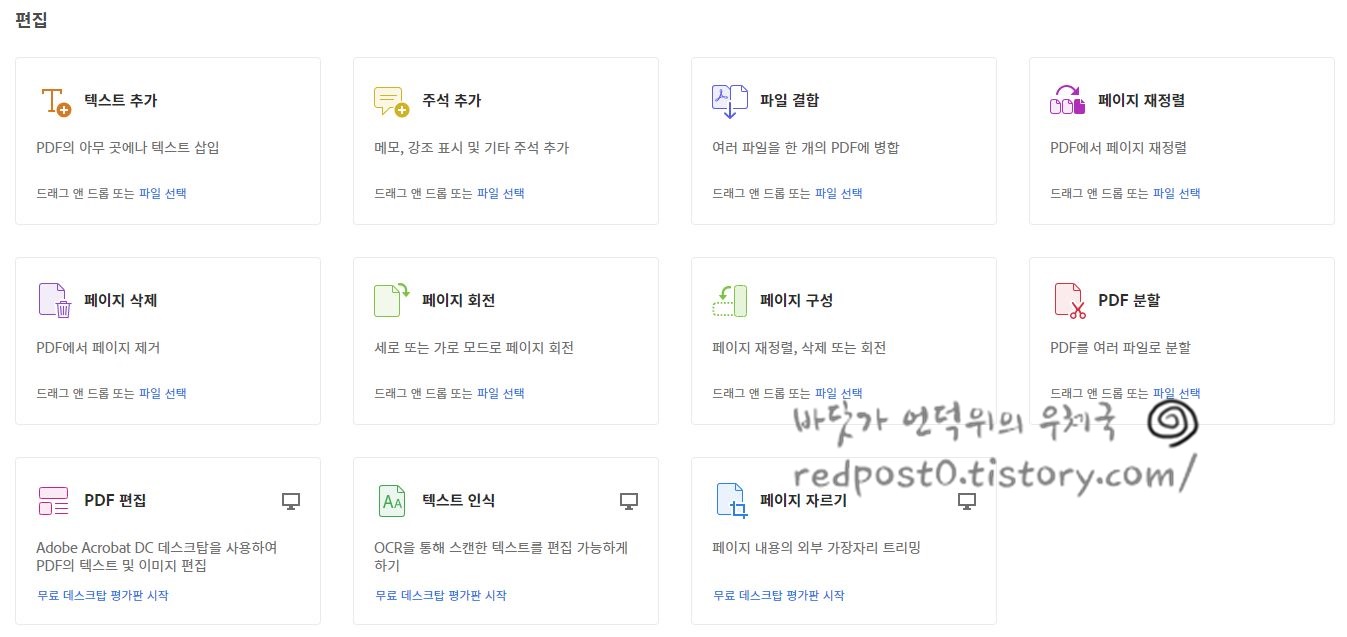 편집탭에 들어가시면 하단에 있는 PDF편집, 텍스트 인식, 페이지 자르기를 제외하면 웹상에서 이용가능합니다.