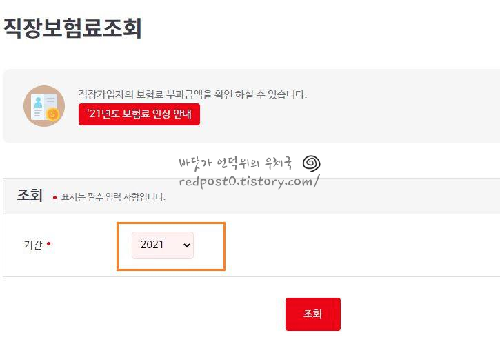 4. 직장보험료 조회 메뉴로 들어가면 원하는 기간(년도)를 선택합니다.