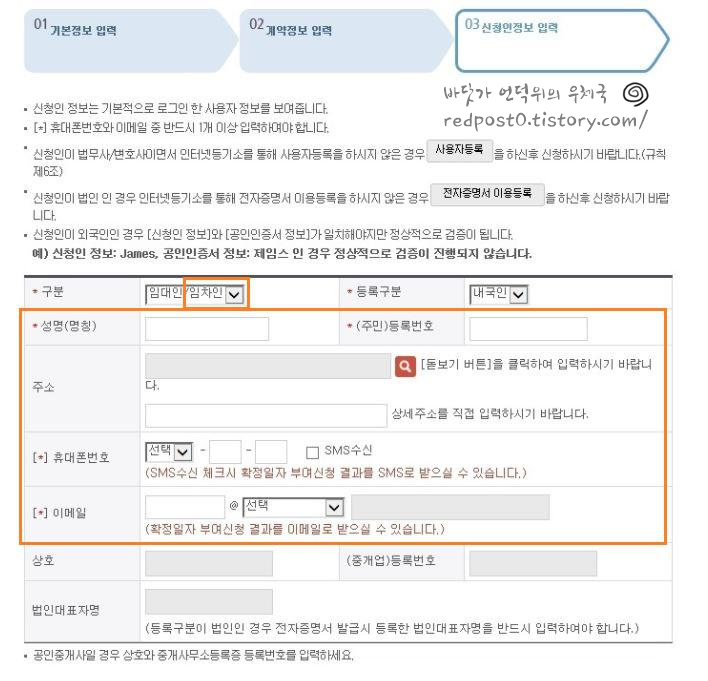 신청자의 정보를 입력하는 란이고요. 임차인을 선택하고 개인정보를 입력합니다.