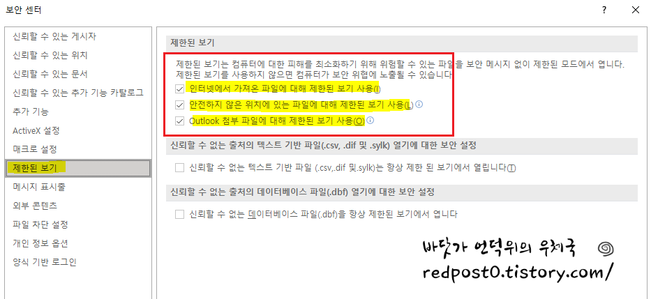 ㅇ 인터넷에서 가져온 파일에 대해 제한된 보기 사용