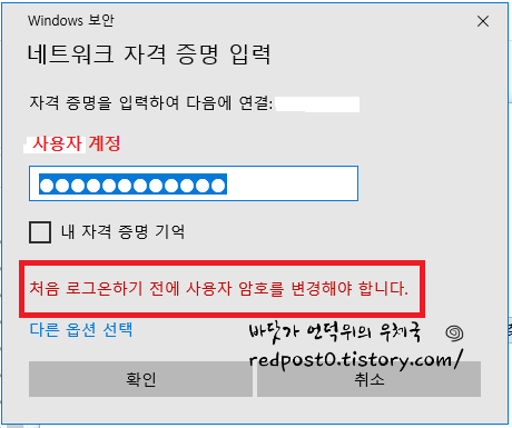 그런데 접속이 되지 않으면서 "처음 로그온하기 전에 사용자 암호를 변경해야 합니다." 라는 문구가 생기면서 접속이 되지않았습니다.