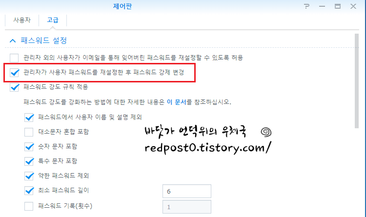 - 관리가자 패스워드를 초기화해주고 사용자가 원하는 패스워드로 변경할 수 있게 해주는 옵션이 설정되어 있었습니다.