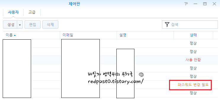 제가 사용하는 계정 상태란에 "패스워드 변경 필요" 으로 되어있었습니다.