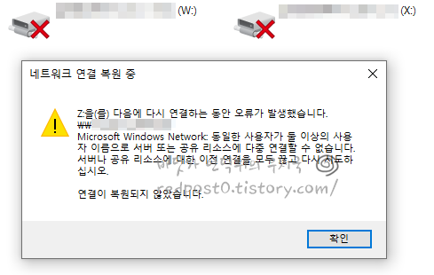 오류가 발생되는 원인은 하나의 네트워크드라이브를 2개의 아이디로 접속할 경우