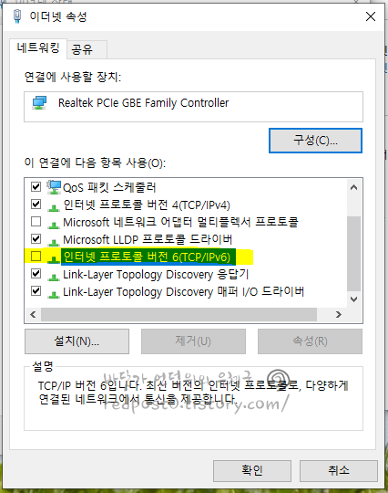 저 역시 IPv6를 사용하지 않기 때문에 설정을 해제 했습니다.