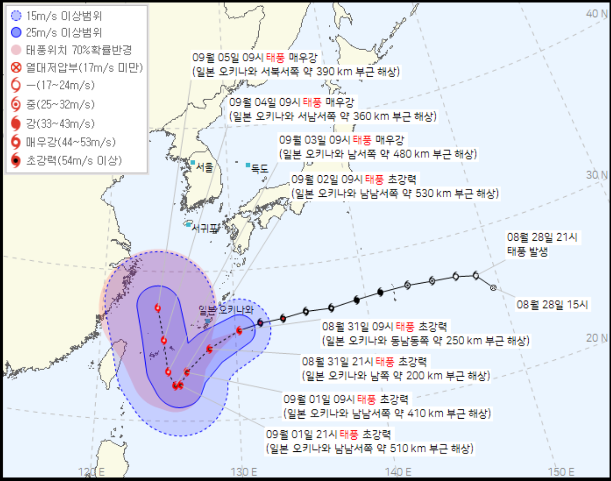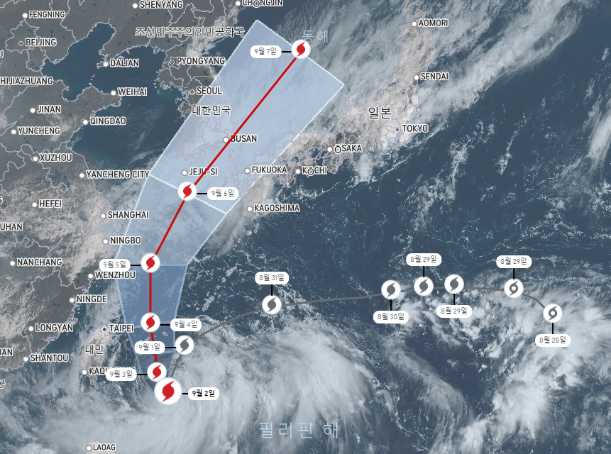 사진을 보시면 아시겠지만 상당히 대형급 태풍이며 2003년 매미와 유사한 경로를 보이고 있습니다.