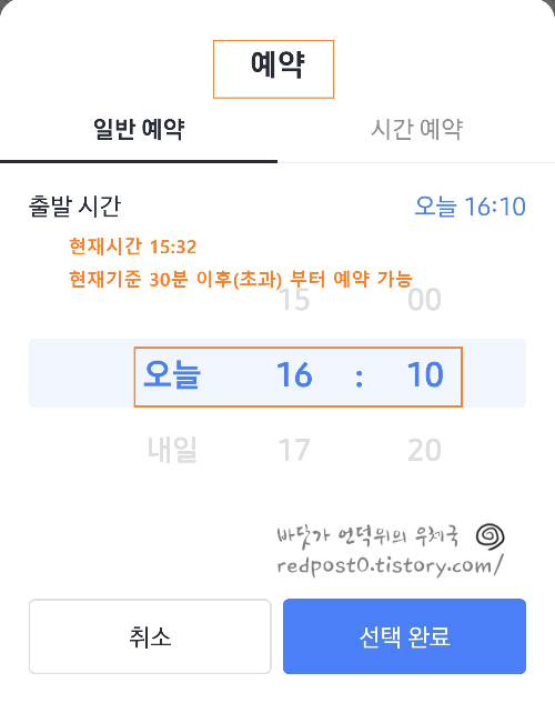 단, 현재시간 기준 30분초과 시간부터 예약이 가능합니다.