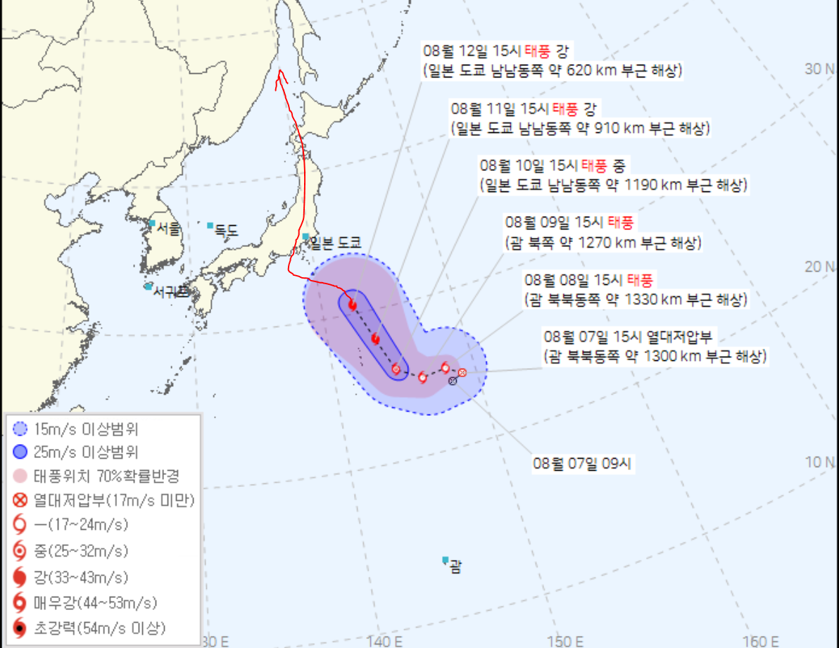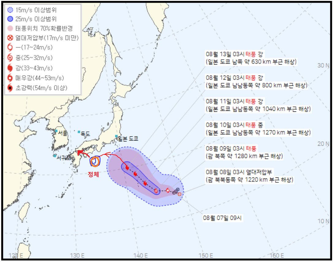 8월 7일 예상경로는 왼쪽으로 이동하여 정체했다가 북동진하면서 일본을 관통하여 북상하는 경로였지만