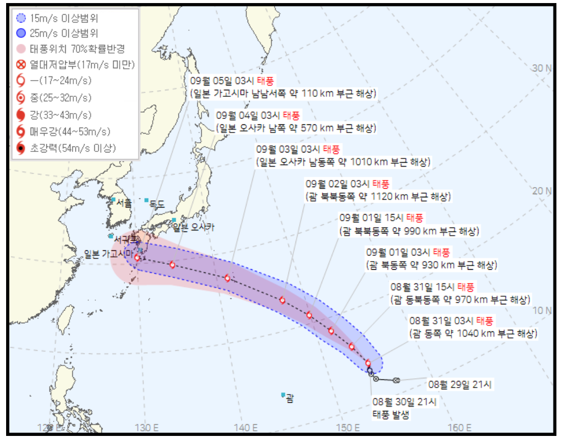 일본에 근접해지는 5일쯤에 경로가 유동적으로 변화할 것으로 예상됩니다.