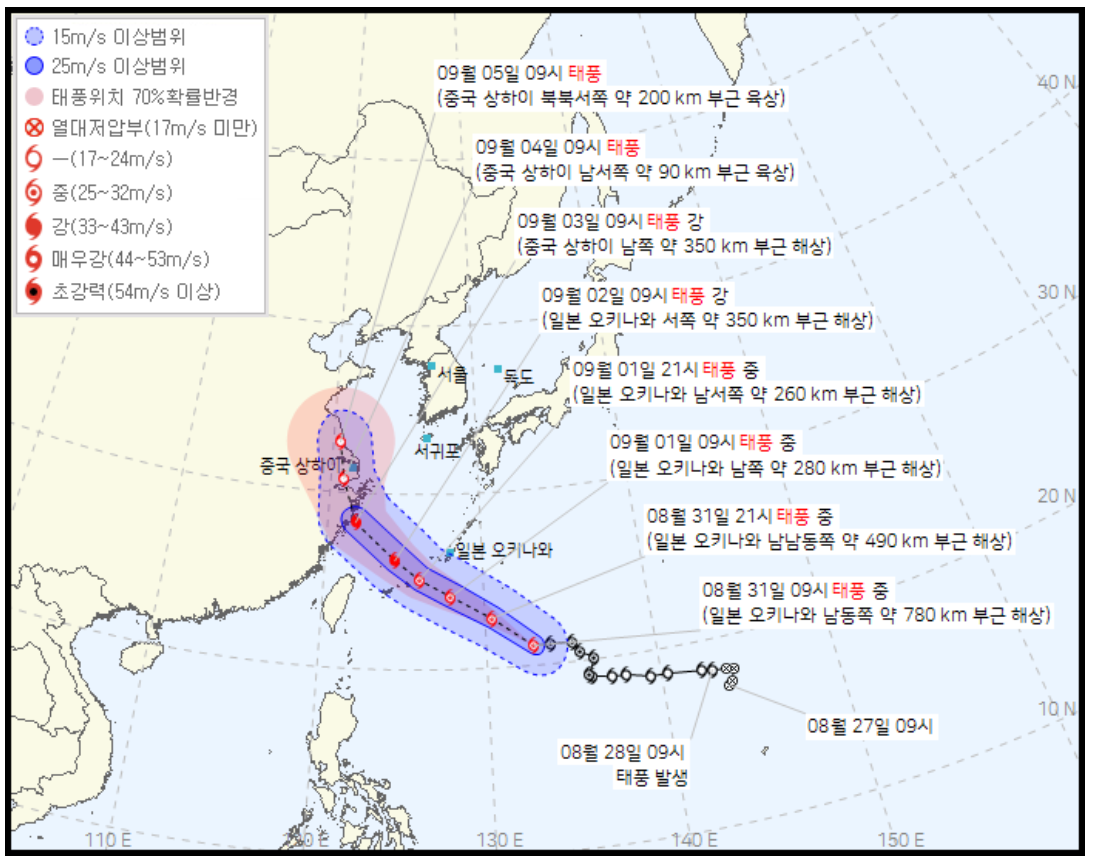 금일 17시 업데이트 정보를 보면, 상하이 동쪽부근으로 상륙하여 더이상 진행하지 않고 열대저압부로 소멸할 것으로 예상하고 있습니다.