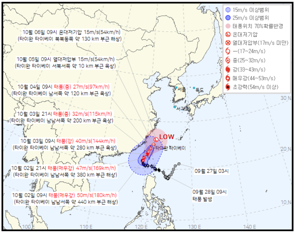 이후 10월 2일 현재 대만 남부방항으로 북서진 하여 대만 남남서쪽 440km부근 해상에서 멈추면서