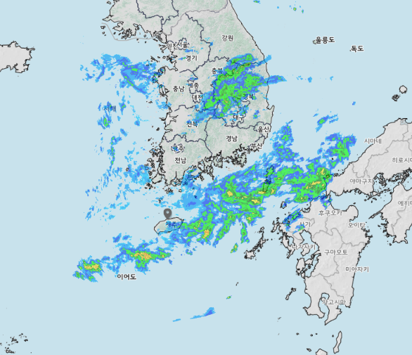 아래쪽 비구름은 제주도를 끼고 길에 이어져 있어
