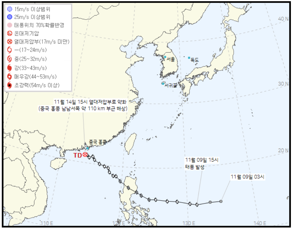 14일 15시경 홍콩 남쪽 해상에서 열대저압부로 약화되어 소멸했습니다.