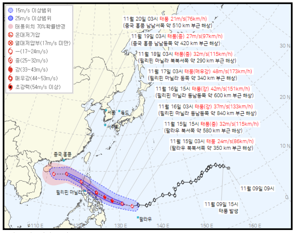 11월 16일 저녁에 필리핀을 지나 중형이하로 세력이 약화되고