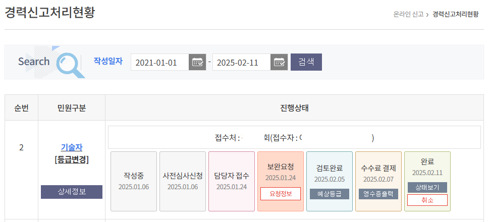 경력신고가 완료되면 아래와 같이 처리현황이 순차적으로 표시가 됩니다.