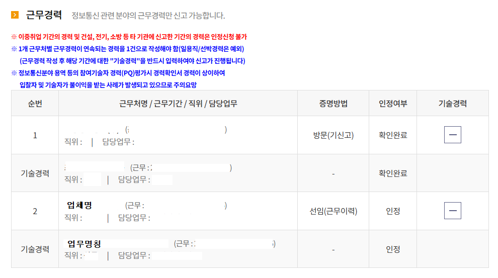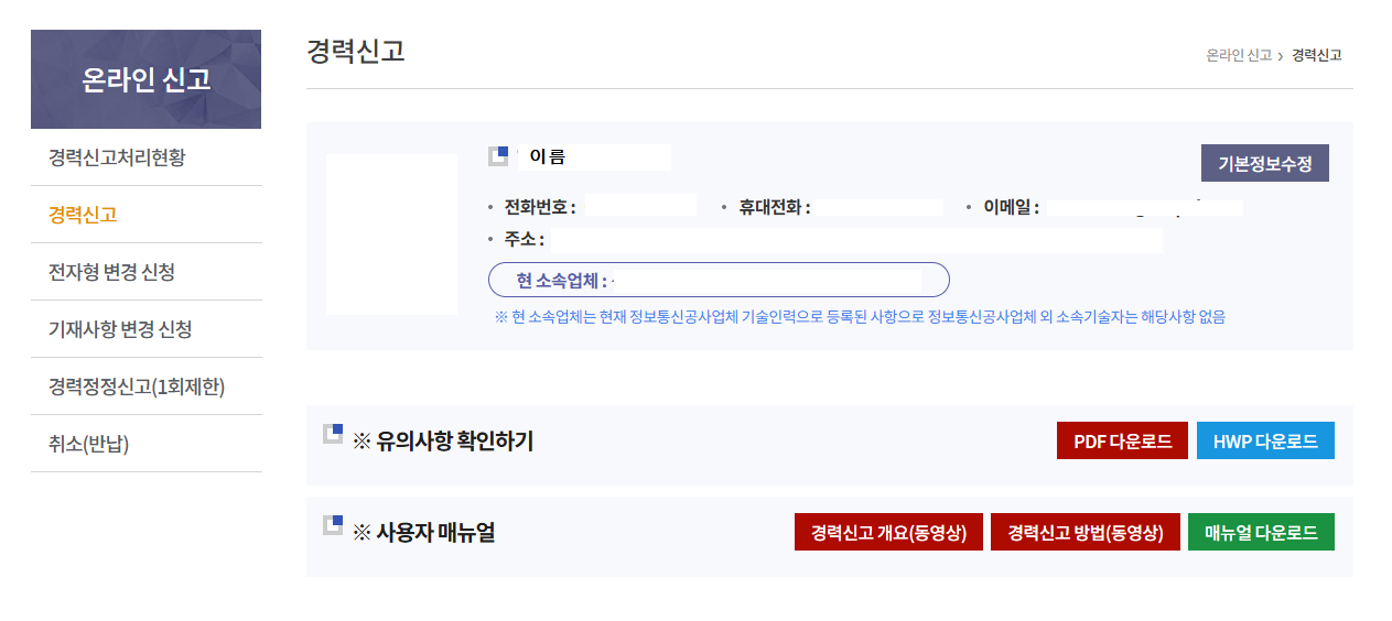 경력신고 페이지 하단 "근무경력"에 신청일까지의 근무기간과 업무를 추가 합니다.