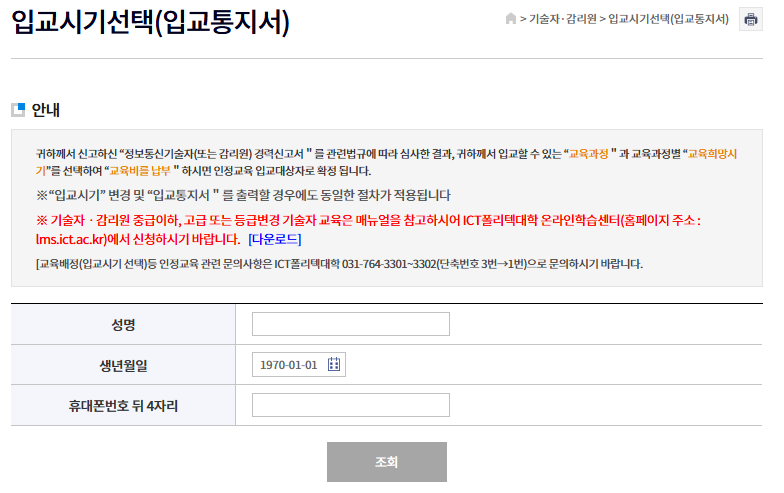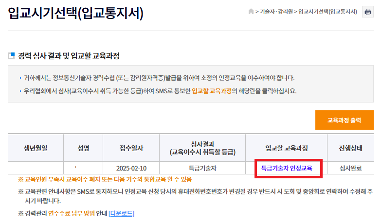 개인정보를 입력하면 교육과정명 "특급기술자인정교육" 이 나옵니다.
