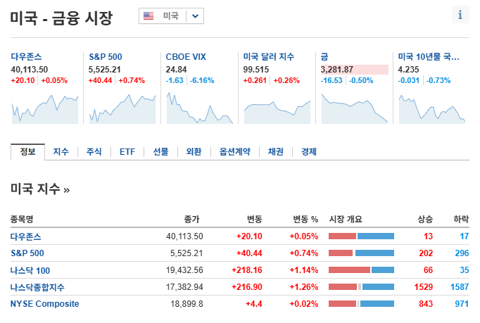 | 다우존스 | 40,113.50 | ▲ 20.10 | +0.05% |