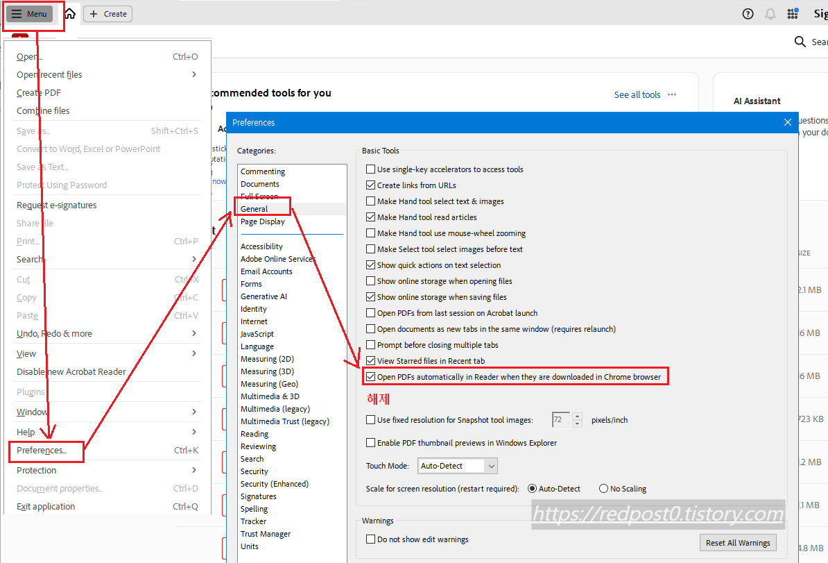 언제인가 부터 크롬에서 PDF를 다운로드 받으면 acrobat 으로 자동 열림이 되어 불편했다.