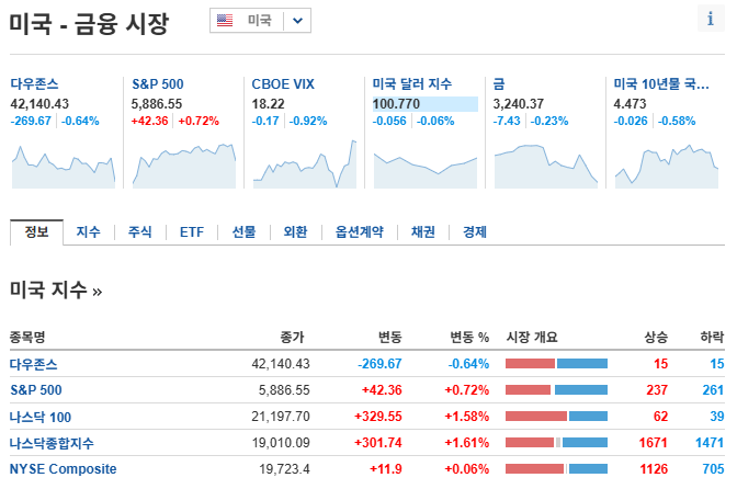 | 다우조스 산업평균 | 42,140.43 | -269.67 | -0.64% |