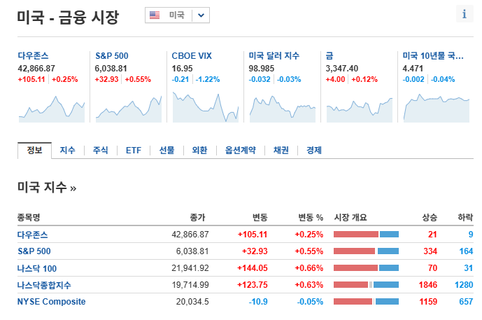 - 다우존스 산업평균: +0.25% 상승, 42,866.87
