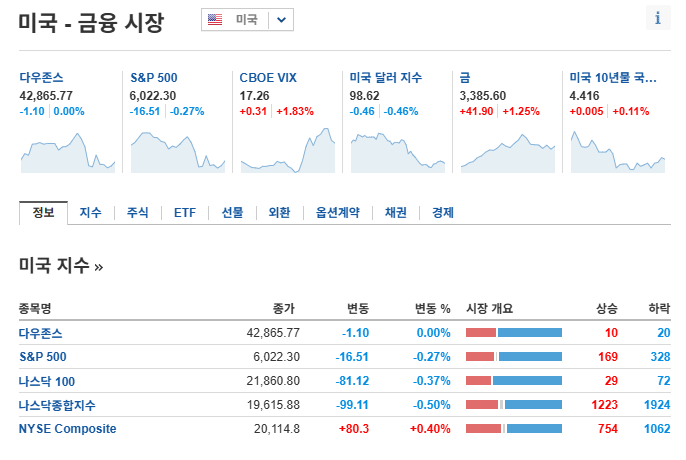 - 다우존스: 42,865.77, 보합 수준 유지