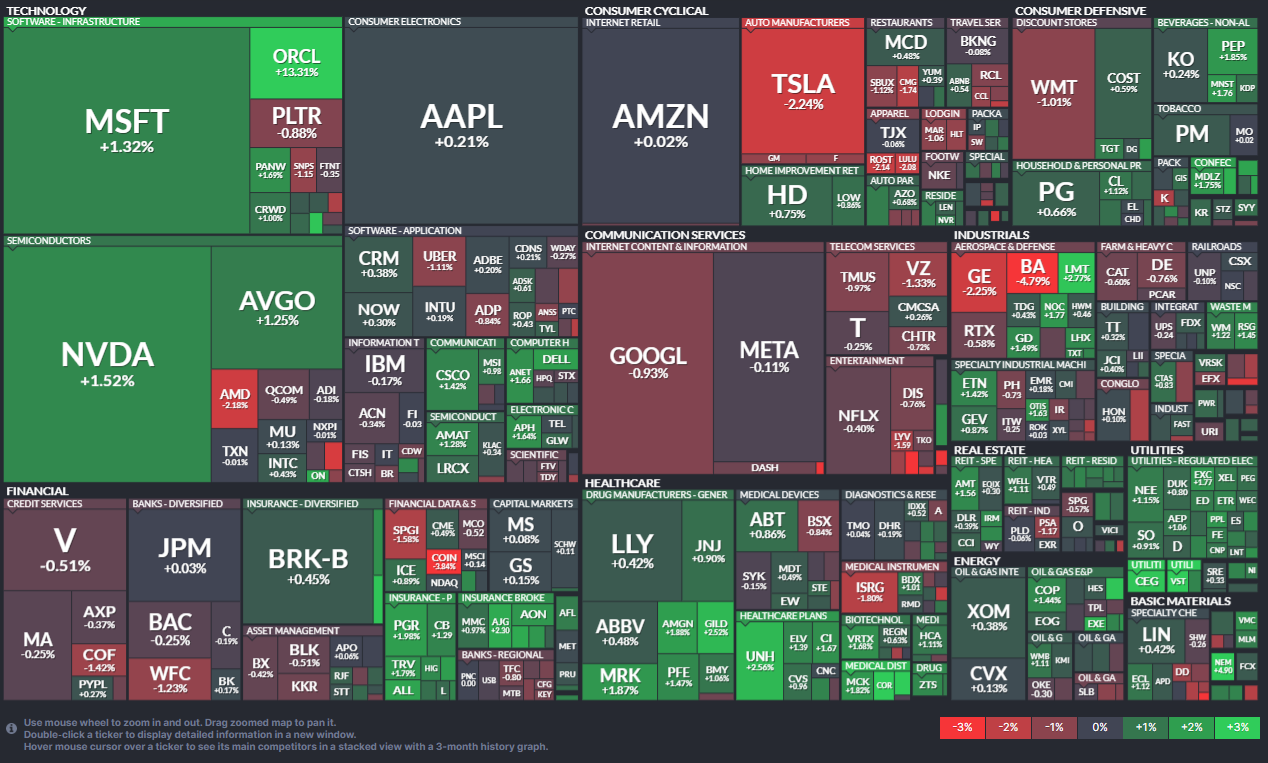 - 기술: Oracle, NVIDIA, AMD, Microsoft 등 클라우드·AI 기술주 주도 상승