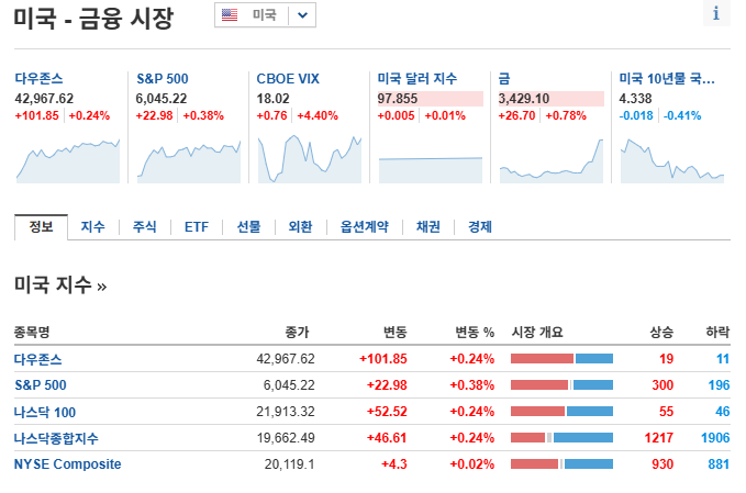 - 다우존스 산업평균: 42,967.62 (+0.20%)