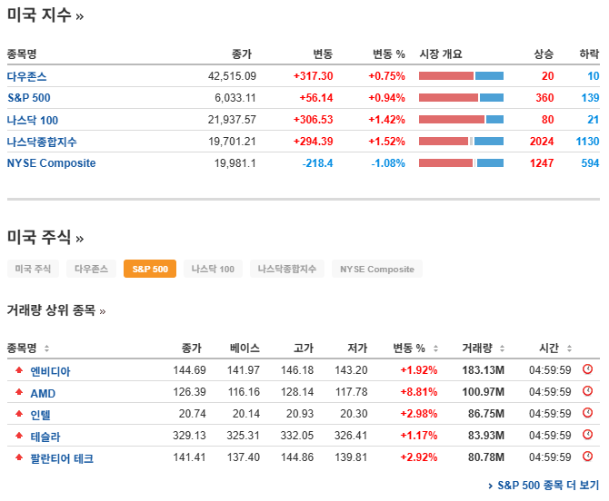 S&P 500: +0.94% 상승—전날 대비 6,033.11에 마감