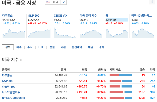 다우존스: 44,484.42 — 보합권, –0.02% 소폭 하락
