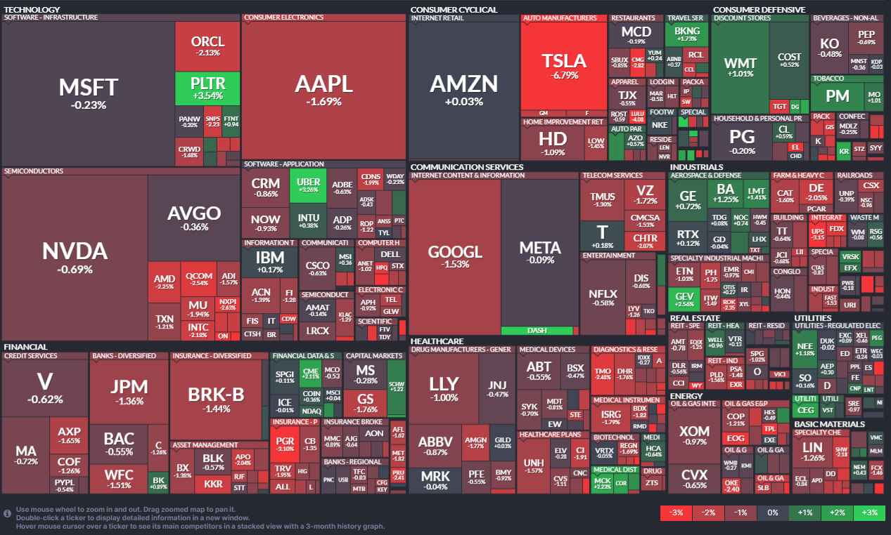 ☞ 전반적으로 큰 폭의 하락장이었으며, 특히 기술 및 소형주 중심의 조정이 뚜렷했습니다.