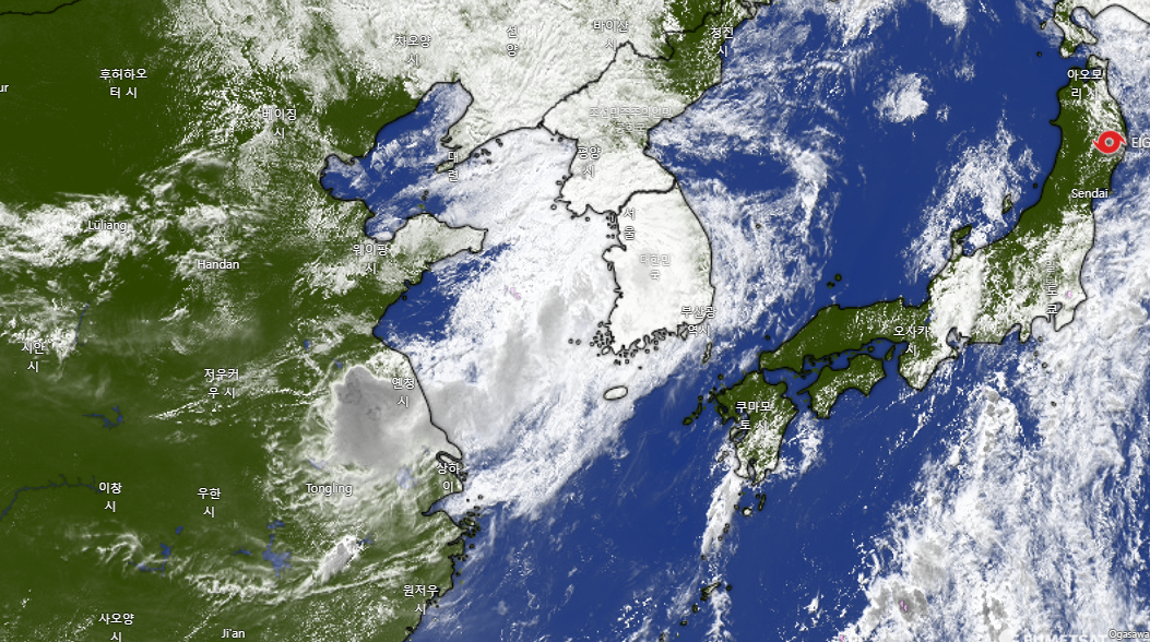 현재 우리 남에서 북으로 대각선방향 길게 구름대가 발달한 것으로 볼 수 있습니다.