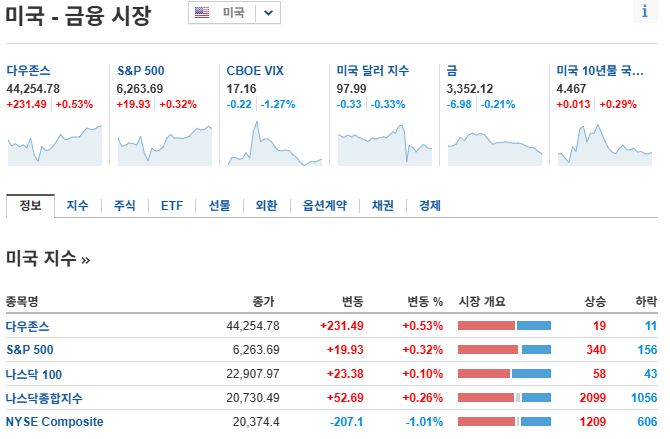 다우존스 산업평균: 44,254.78 → +0.53% 상승