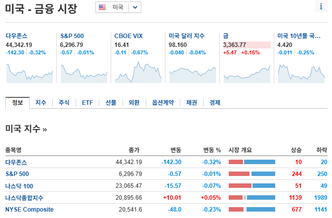 다우존스 산업평균: +0.52%, 44,484.49 — 최고 마감가 근접