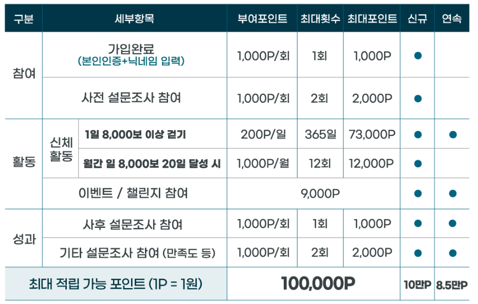 | 구분 | 최대걸음/일 | 적립 방식 |