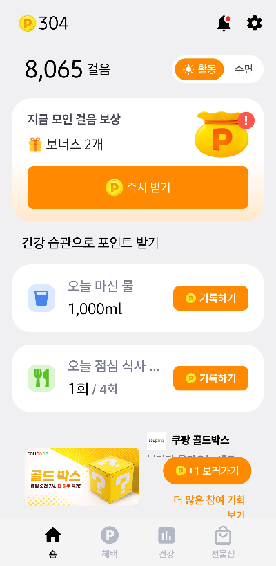 - 8,000걸음/일 → 200원, 자전거 5/10km → 각 300원