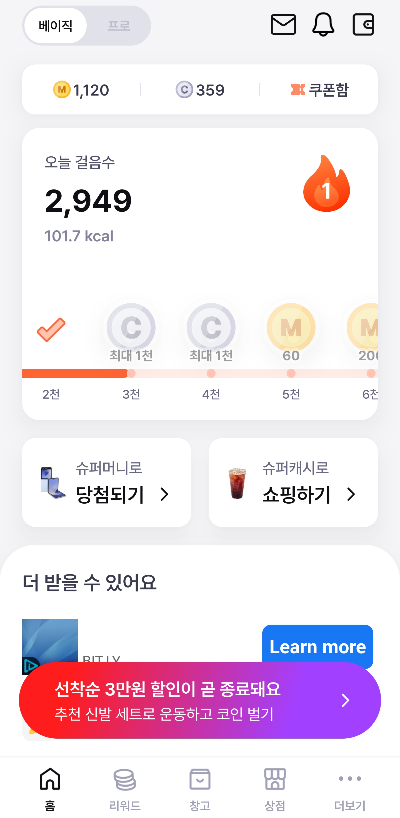 몇년 전부터 캐시워크를 설치해서 1년 열심히 걸어서 3만원 포인트 얻어서 편의점에서 교환했었는데...