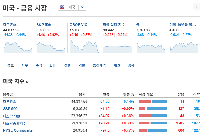 ✔️ 다우존스 산업평균: 44,837.56 –0.14% 하락