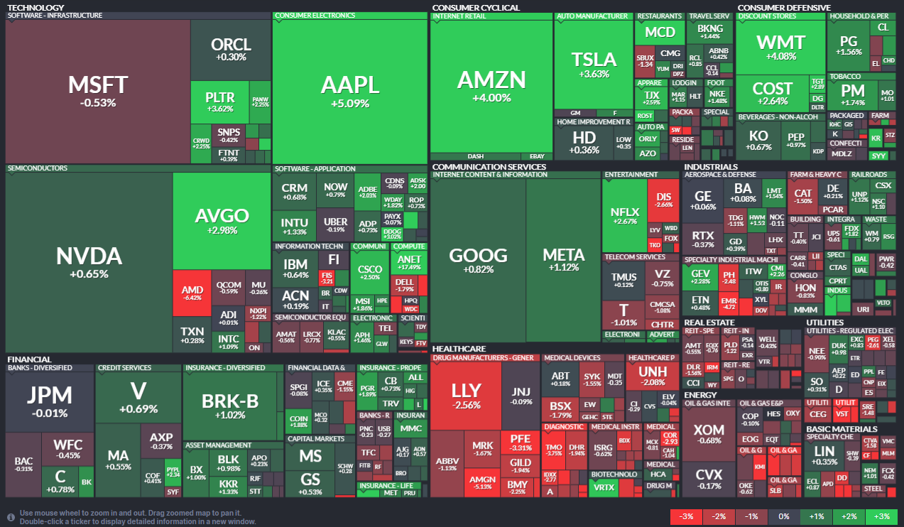 ✔️ 기술 대형주 중심의 랠리가 견인하였지만, 일부 업종 실적 부진으로 차익 매물 및 분산 흐름 출현
