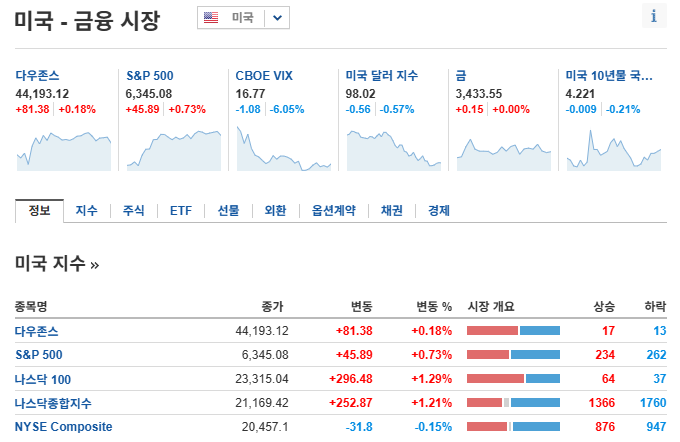 ✔️ 다우존스 산업평균: +0.18%, 44,193.12 (소폭 상승)