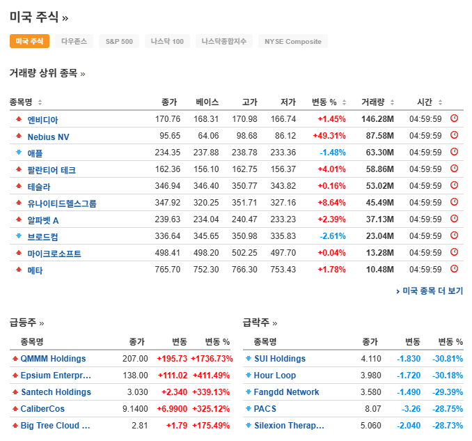 UnitedHealth(+8.6%) 등 헬스케어 강세, AI 수요 기대 기반 Nebius +49%, Oracle 실적 호조로 장후 급등 ~25%