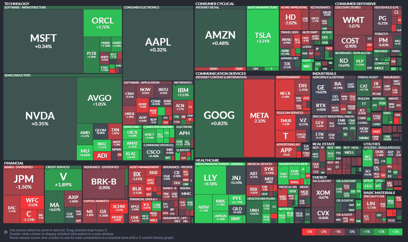 - S&P 500 : +0.3% 상승 → 6,711.20 (▲22.74포인트) — 사상 최고치 경신